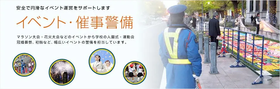 選ばれて30年以上の実績交通誘導・交通警備のプロフェッショナル 交通警備はお任せ下さい 交通誘導警備 事故のない安全・安心な街づくりの警備 住民に配慮した丁寧な警備で高い評価を得ていますこのようなお悩みはございませんか? 急に警備員が必要になった。 経験豊富で丁寧な警備員に任せたい。 警備計画や見積もりを素早く欲しい。 イベント警備の実績も豊富です イベント・催事警備 安全で円滑なイベント運営をサポートします マラソン大会、花火大会などのイベント警備から、学校行事、冠婚葬祭、初詣などの催事の警備まで、さまざまなイベントを警備した実績も豊富です。 安全・丁寧・スムーズに誘導します 駐車場警備 接触事故が多い駐車場を安全に誘導します 接触事故の多い駐車場を経験豊富な警備員が安全・丁寧・スムーズに誘導いたします。駐車場の防犯警備もお任せください。