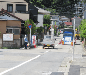 この日は、神奈川県逗子市の池子でガス管の取替工事に弊社警備員が5名体制で対応しています。